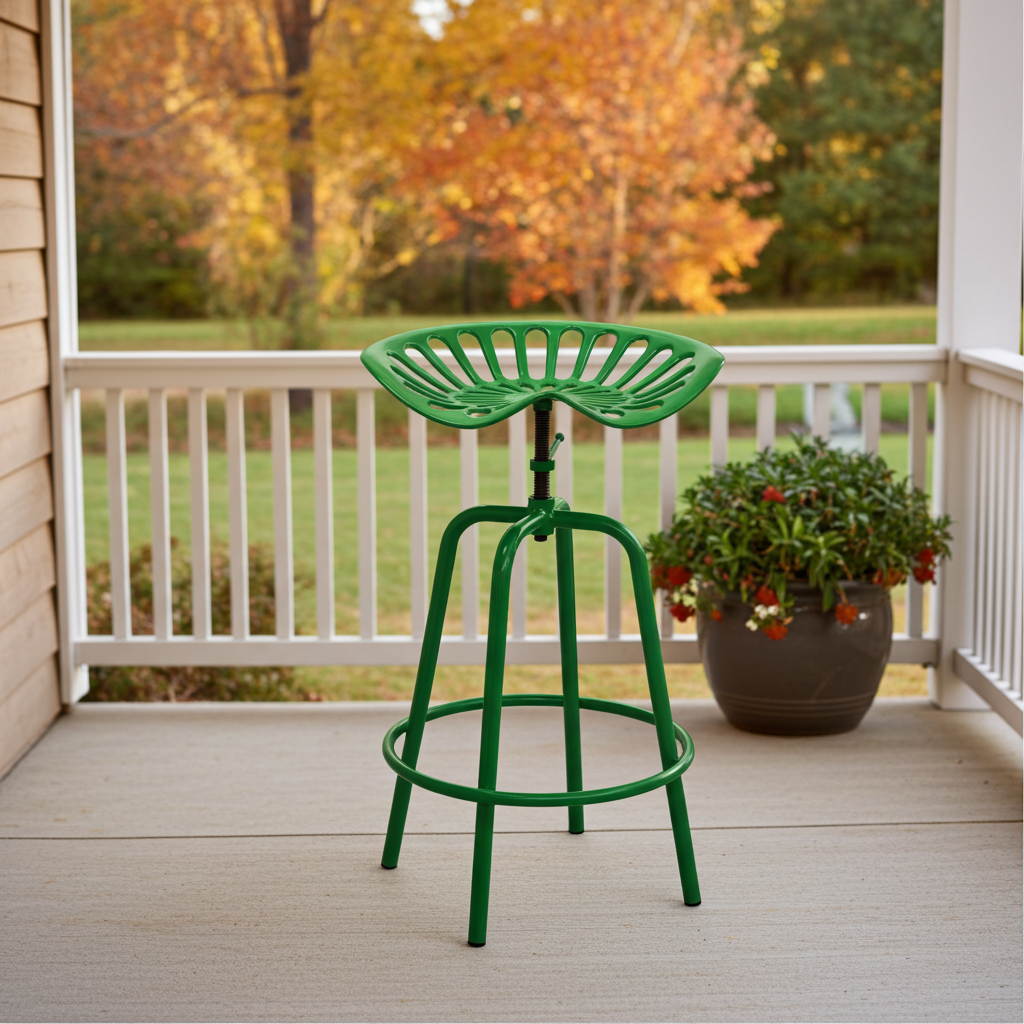 Bring vintage charm and industrial strength to your outdoor space with this farmhouse-inspired Tractor Seat Stool. Made from solid steel with a bold green powder-coated finish, it's built to withstand the elements and add character to your patio, porch, or garden setup.